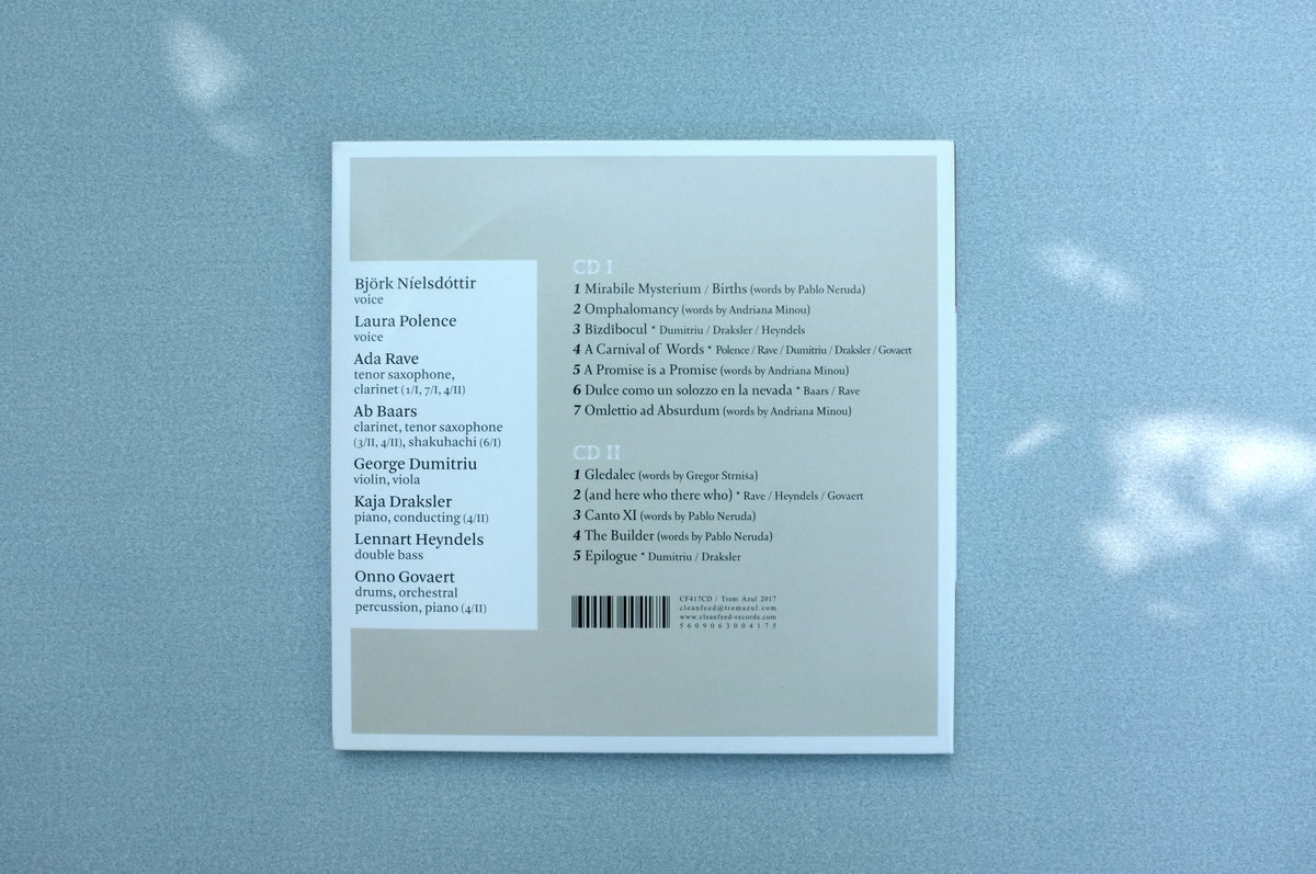 KD Octet's debut album. A digipack, wrapped in thin plastic, with two discs in paper sleeves. Design by Travassos, band photo by Francesca Patella.